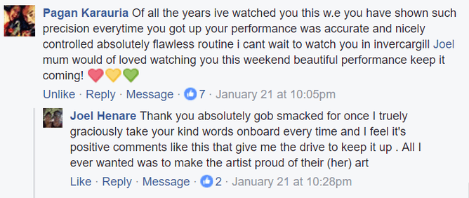 The artist Joel refers to in his reply is Pagan's mother Tina Rimene, who Joel credits alongside the late Joanne Kumeroa as key influences on his wonderful career in the sport.