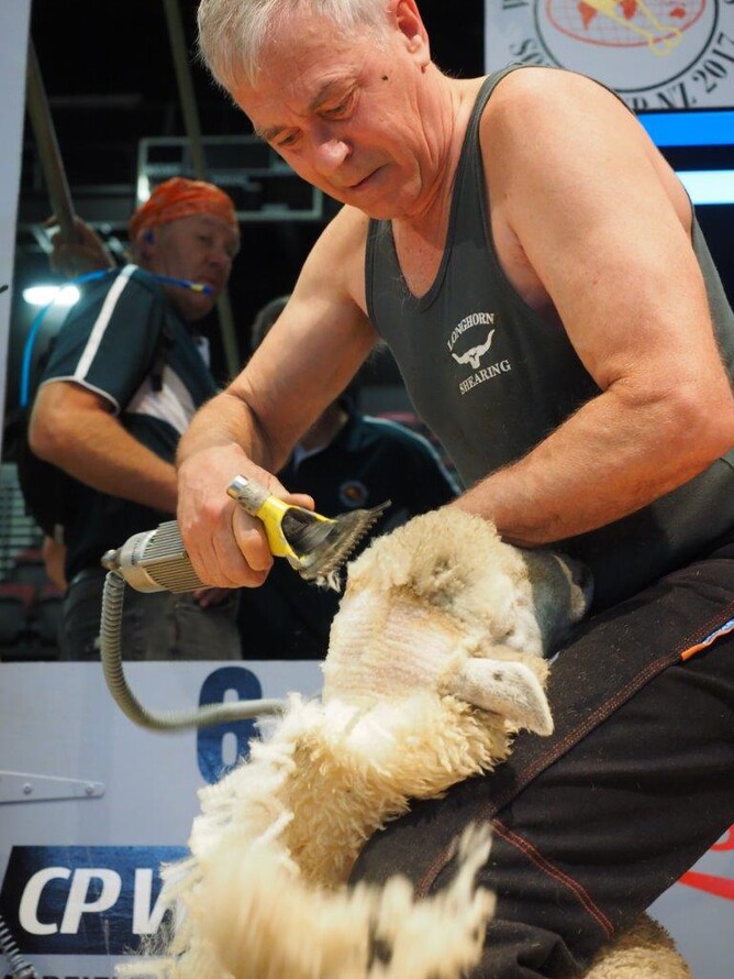 One of only "five" shearers in Estonia – another is son Ando - the 64-year-old shearing his third World championships comes with his own portable shearing plant, a plug-in power pack which can run on solar energy and battery power, and comes complete with pig-tail power lead.
