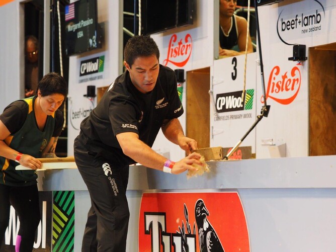World championships and 2012 World title winner favourite Joel Henare, now living in Dunedin but from Gisborne, won the All Nations woolhandling final, repeating an All Nations win he had scored soon after being eliminated from the World Championships race in Ireland, in 2014.