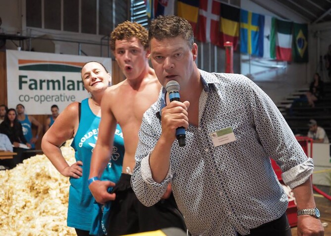 Above: Christin Wolland and son Tyrone with commentator Gerald Spain confirming wool weight at 173kg.